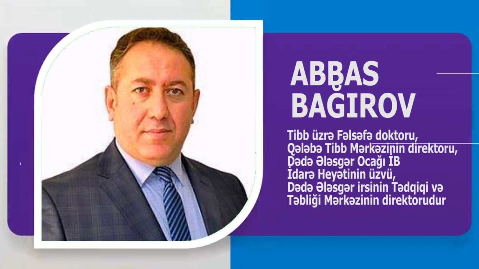 Azərbaycan səhiyyə sistemində öz peşəkarlığı, idarəçilik bacarığı və insani dəyərlərə sadiqliyi ilə seçilən şəxslərdən biri tibb üzrə fəlsəfə doktoru Abbas Bağırovdur. O, uzun illərdir həm həkim kimi praktik fəaliyyətdə, həm də səhiyyə müəssisəsinin rəhbəri olaraq ölkədə tibbi xidmətlərin inkişafına mühüm töhfələr verir.