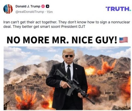 ABŞ lideri paylaşımında hərbi əməliyyatlar fonunda əlində avtomatla təsvir olunmuş foto da yayımlayıb və üzərində “Artıq yaxşı oğlan olmayacaq!” sözləri yer alıb.