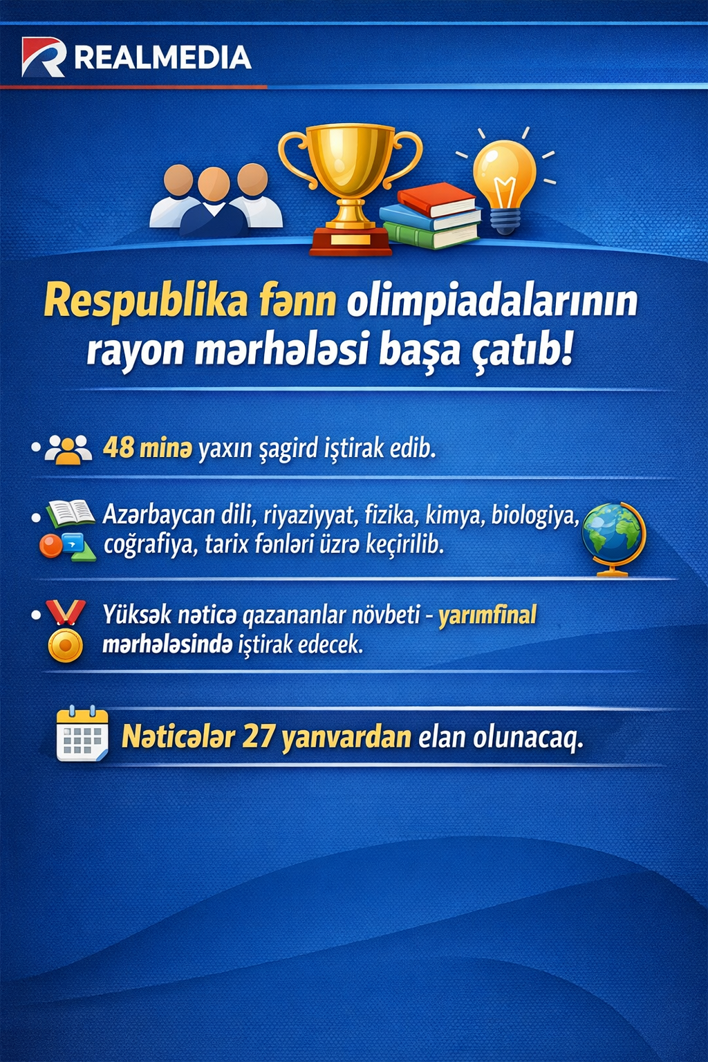 Respublika fənn olimpiadalarının rayon (şəhər) mərhələsi ölkə üzrə uğurla təşkil olunub. Olimpiadada VIII–XI sinif şagirdlərindən ibarət təxminən 48 min nəfər iştirak edib.