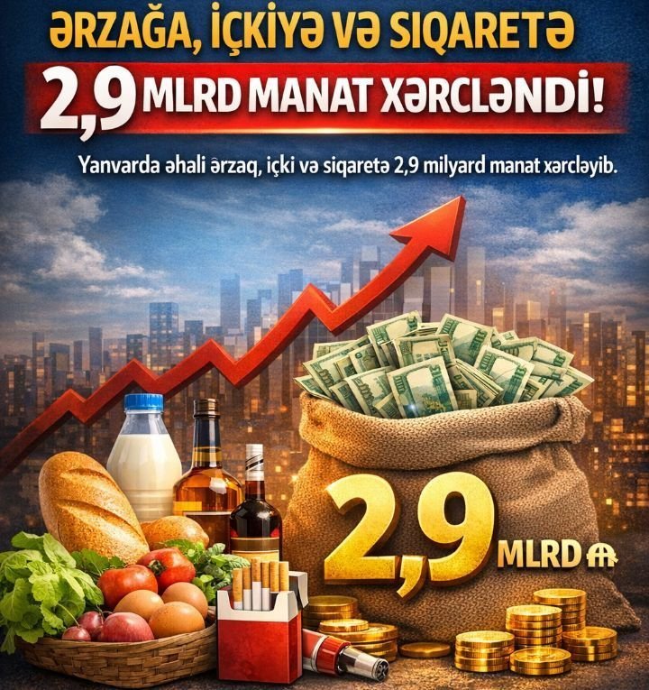 Yanvar ayında ölkə əhalisi ərzaq məhsullarına, içkilərə və siqaretə ümumilikdə 2,9 milyard manat xərcləyib. Bu, əvvəlki aylara nisbətən istehlak xərclərində davamlı artımı göstərir.